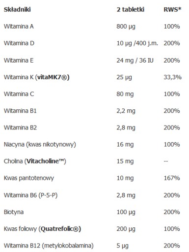 - Добре досліджені інгредієнти від відомих світових виробників: вітамін K2 у натуральній формі VitaMK7®, холін Vitacholine™ і фолієва кислота у формі біодоступного фолату Quatrefolic®.