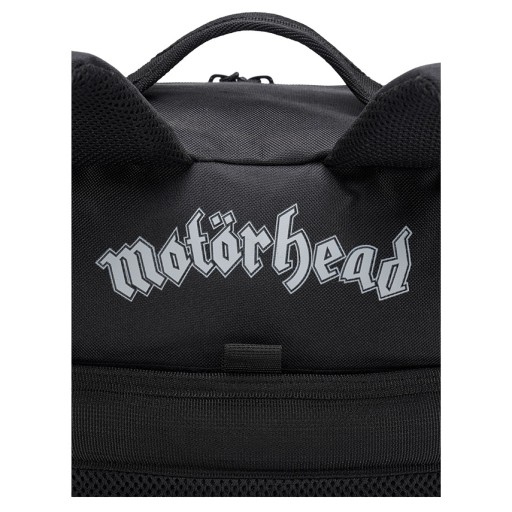 Він виготовлений з міцного матеріалу, стійкого до розривів і стирання. На рюкзаку є позначки та значки групи Motörhead.