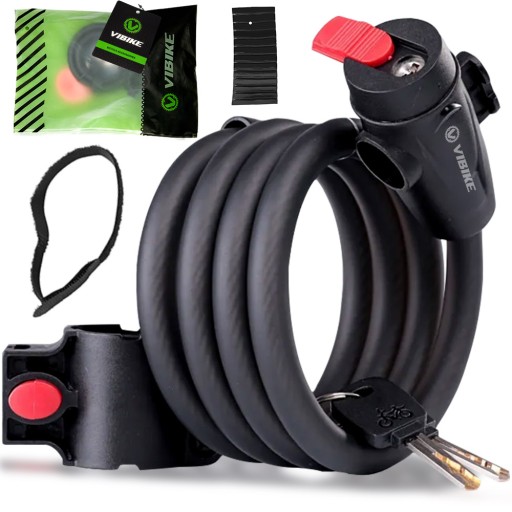 Велозамок VIBIKE виготовлений з матеріалів найвищої якості. Плетений сталевий трос збільшує міцність і оточений м'яким пластиком, завдяки чому виріб не подряпає фарбу вашого велосипеда. За закриття безпеки відповідає якісний замок на ключ, оснащений кришкою, що захищає його від забруднення. У комплект також входить тримач для зберігання застібки під сідлом і два ключі.