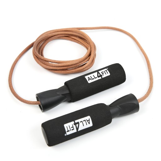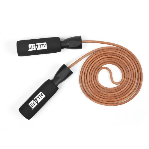 Шкіряна скакалка ALL4FIT для інтенсивного тренування швидкості та координації, зміцнення м'язів ніг і для розминки перед тренуванням. Скакалка виготовлена з високоякісної шкіри, яка має високу стійкість до стирання. Трос встановлений на підшипниках, що гарантує плавне обертання, дозволяє займатися на дуже високій швидкості і запобігає скручування троса. Ергономічні ручки добре лягають в руку, а їх поролонове покриття запобігає ковзанню ручок у спітнілих руках.