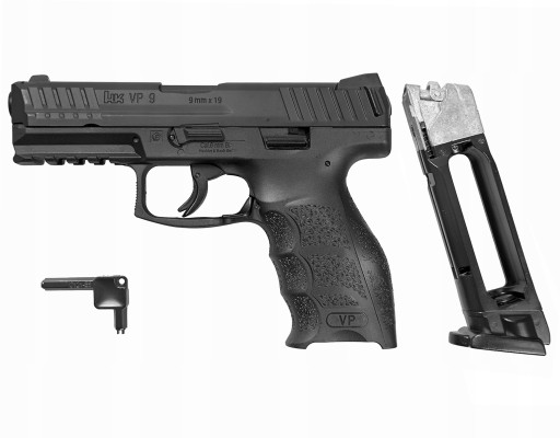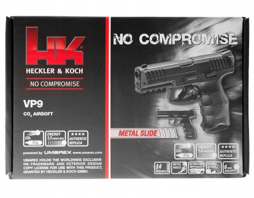 Репліка газового пістолета Heckler&Koch VP9 виготовлена з пластику та металу. Корпус і курок виконані з пластику, а замок - з металу. Пістолет має ліцензійне маркування Heckler & Koch.