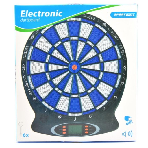 Електронний дартс розрахований на 1-8 гравців. Пакет включає 6 дартсів, 18 ігор і 159 версій гри. Щит чорного кольору, а мішень — синьо-білого кольору. Живлення від 3 батарейок типу АА (не входять у комплект виробу) або адаптера, що входить у комплект.