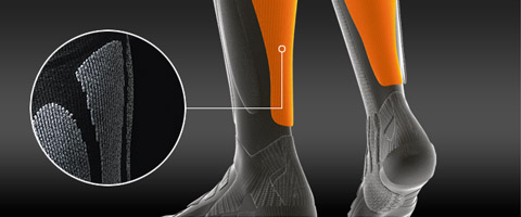 Ефективно поглинає удари та зменшує тертя області ахіллового сухожилля об взуття, запобігаючи таким чином неприємним подряпинам на шкірі. Він захищає від надмірного навантаження на це дуже чутливе сухожилля, захищаючи його оточуючими подушками, які створюють буферну зону між взуттям. Він виготовлений з матеріалу, який має високу стійкість до стирання та ударів, тому збільшує довговічність шкарпеток у цій зоні.