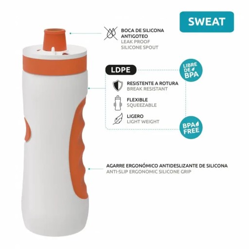 Спортивна пляшка для води з блокуванням потоку, що дозволяє роздавити пляшку без ризику протікання. Для повного ущільнення поверніть кришку та закрийте струменевий клапан. Адаптований до анатомічної будови руки, він запобігає ковзанню, навіть коли пляшка волога.