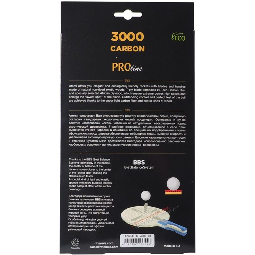 Нова ракетка для настільного тенісу Atemi 3000 Pro надає м'ячу запаморочливу швидкість. Професійна модель характеризується відмінними ігровими параметрами, які будуть активно підтримувати вас під час тенісних змагань. Корпус виготовлений з двох шарів технологічно передового вуглецевого волокна та спеціальної екзотичної фанери. Технологія BBS. Гнучка губка з мікробульбашками. Увігнута ручка.