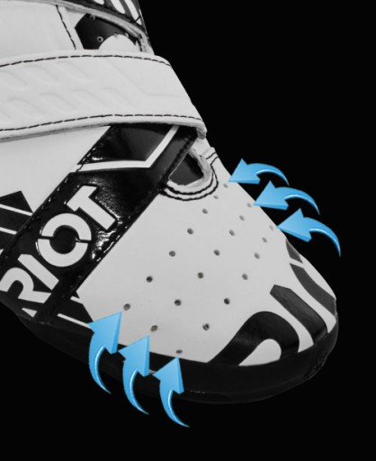 Верх із мікрофібри використовується для забезпечення міцного зовнішнього шару для Bont Riot TR+, а сітчасті вставки забезпечують високу повітропроникність взуття.