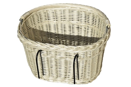 Велосипедна корзина з гачками З БІЛОГО ПЛЕТЕННЯ (БІЛА З М'ЯКИМ ЕКРЮ) - ідеальна для велосипедних прогулянок, шопінгу, для перенесення собаки чи кота. Дуже міцна конструкція гарантує безпечне та зручне перенесення покупок. Кошик розміщується на передній частині керма за допомогою відповідним чином зігнутих металевих стрижнів, закріплених спеціальним пластиком.