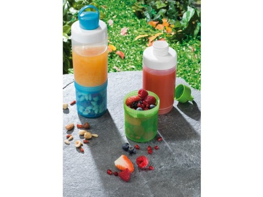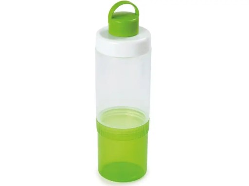Завдяки універсальному використанню зелена пластикова пляшка з харчовим контейнером підходить для йогуртів, мюслі, салатів, фруктів, овочів і холодних супів.