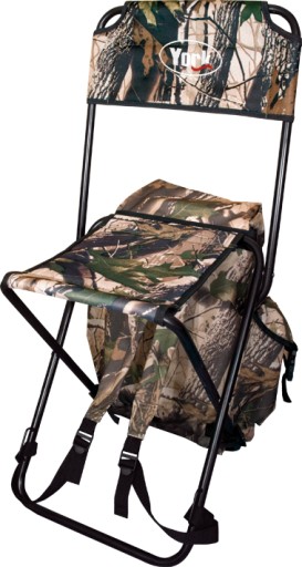 Крісло з рюкзаком і спинкою. Камуфляжний матеріал 100% поліестер, покритий водонепроникним шаром ПВХ. Обсяг рюкзака приблизно 18 літрів. Два бічних відділення, що застібаються на застібки, і одне основне відділення. Зелений колір. Вся річ покрита клапаном і зашнурована.