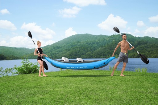 Похід до води - ідеальний спосіб провести вільний час. Щоб урізноманітнити цей безтурботний час, придбайте додаткові аксесуари для басейну. Байдарка також ідеально підходить для розважальної поїздки до озера або басейну. Він виготовлений з міцного вінілу, стійкого до пошкоджень. Комфортний кокпіт має два надувних сидіння з м’якими спинками, щоб вам було комфортно під час довгих поїздок. Знімне центральне ребро допомагає підтримувати курсову стабільність. Конструкція, що облягає форму, запобігає потраплянню води в кабіну та зануренню вас або вашого обладнання. Поручень із вбудованими люверсами дозволяє легко повторно сісти в каяк з води. Вбудований зливний клапан дозволяє легко спустити повітря з байдарки в кінці дня. Ви також можете використовувати міцні ручки для перенесення каяка, коли він накачаний. Ви також отримаєте пару алюмінієвих весл довжиною 230 см і ремонтну латку для ремонту будь-яких випадкових потертостей або проколів.