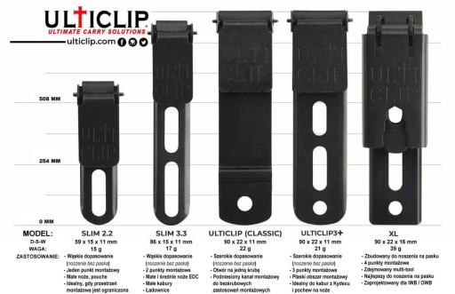 Тонка, подовжена версія Ulticlip, довжина 3,3" (84 мм). Для використання в піхвах Kydex для носіння в кишені штанів, під поясом або на поясі. Загальна довжина 85 мм, ширина 15 мм, висота 11 мм, вага 17 г.