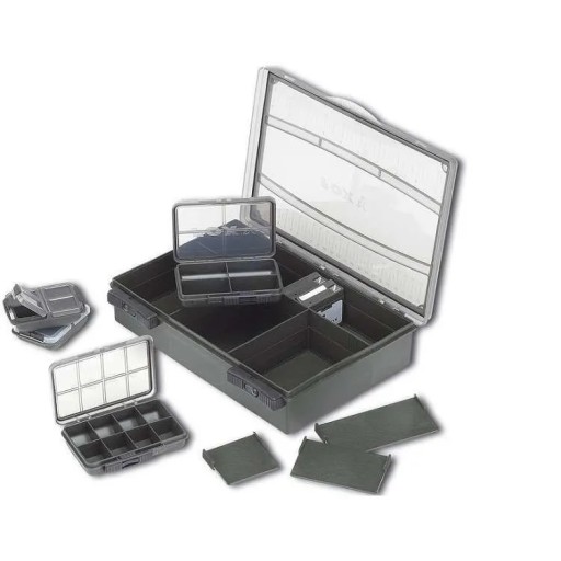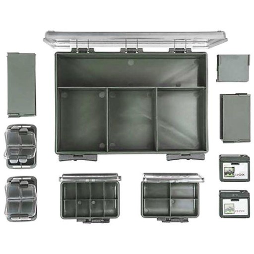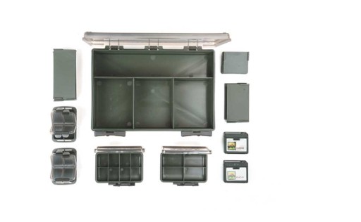 Набір Deluxe поставляється з повною колекцією ящиків, необхідних для зберігання різних речей для коропа. Збільшеною місткістю та легкістю доступу до вмісту коробка зобов’язана своїй двосторонній структурі.Ударостійка конструкція з міцного пластику з водонепроникними герметичними краями, міцними петлями та міцними ковзаючими застібками. Коробку можна налаштувати відповідно до ваших потреб за допомогою роздільників, що входять у комплект.
