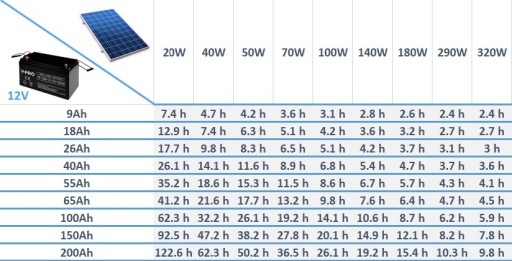 У таблиці нижче показано час, необхідний для заряджання наявних на ринку акумуляторів залежно від потужності фотоелектричної системи.