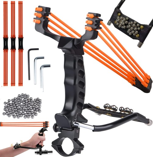 - ✔️【Рогатка】: наша професійна мисливська рогатка має широку дугу та потрійну міцну гумку. Ергономічна плавно регульована рукоятка надійно та зручно лежить у руці.