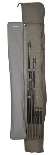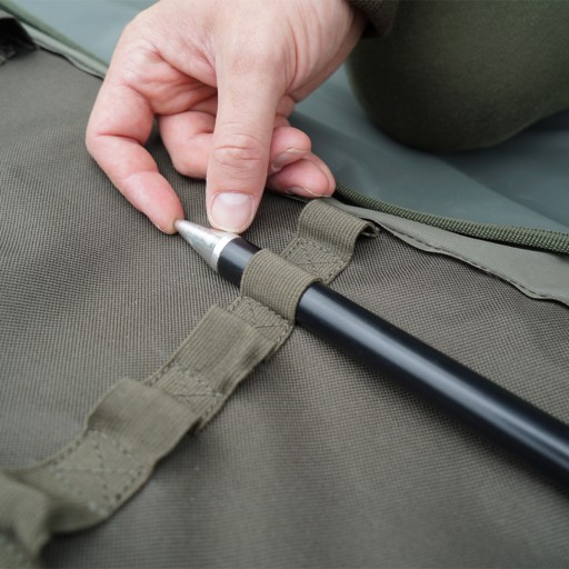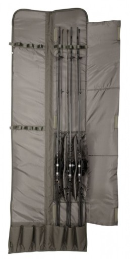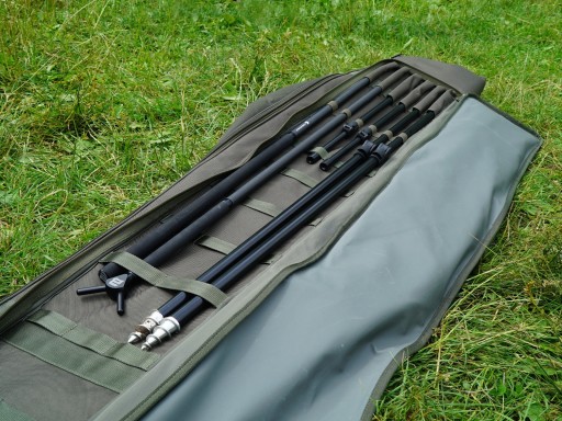 На зовнішній частині є велика кишеня на блискавці, яка оснащена системою гнучких кріплень, у які ми можемо вставляти опори під час транспортування. На передній частині чохла також є водонепроникний знімний мішок, у якому ми можемо транспортувати мокрий сачок або мішок для ваг. Сумка доступна у версії для 2 вудилищ зі зброєю та 2 без зброї та 3 вудок із зброєю та 3 без зброї.
