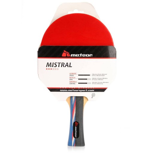 Модель з останньої серії ракеток для настільного тенісу Meteor. MISTRAL*** - нова, оновлена версія ракетки HAN***. Він був виготовлений з матеріалів найвищої якості. Використана гума забезпечує відмінну гнучкість і еластичність, а також дуже хороший контроль. Ракетка повинна бути захищена від вологи та УФ-променів.