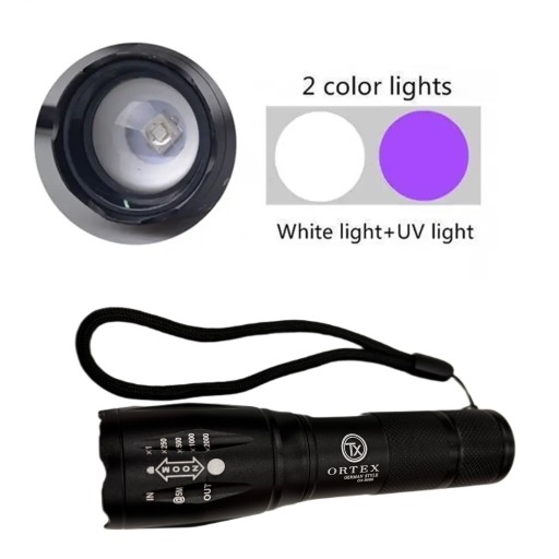 - Тактичний ліхтарик з дуже потужним джерелом світла - УФ і білий