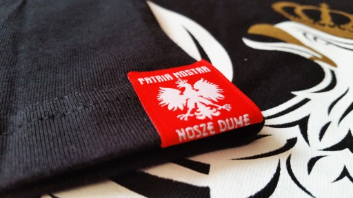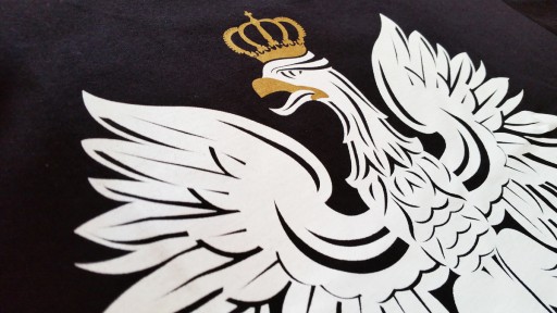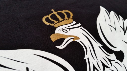 Чорний колір матеріалу в поєднанні з гордим білим орлом із золотою закритою та увінчаною хрестом короною є ідеальною пропозицією для кожного патріота. Гордість, яку виражає цей національний символ, а також простота та пряме повідомлення надають йому унікального характеру.Друк на лицьовій стороні виконано змішаними фарбами для трафаретного друку. Щоб додатково підкреслити гордість польського білого орлана, ми використали золоту фарбу (глітер), що надає ефект блиску. Для найкращого відтворення та інтенсивності білого кольору ми вирішили нанести 2 шари фарби.