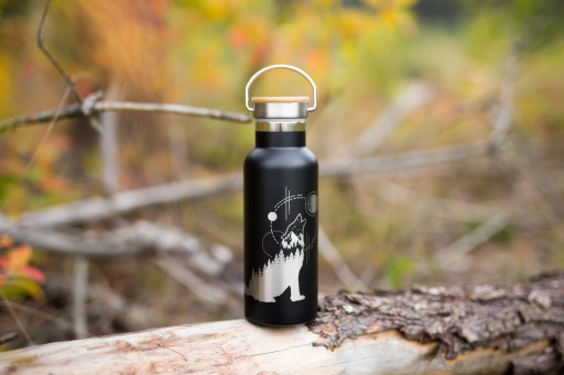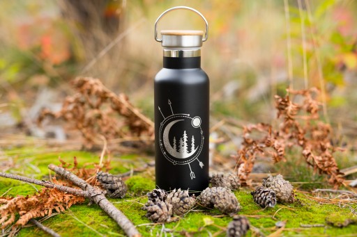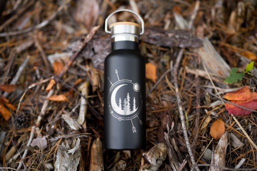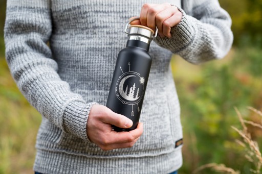 Термопляшка з оригінальним гравіюванням і персоналізованою бамбуковою кришкою неодмінно зацікавить оточуючих.