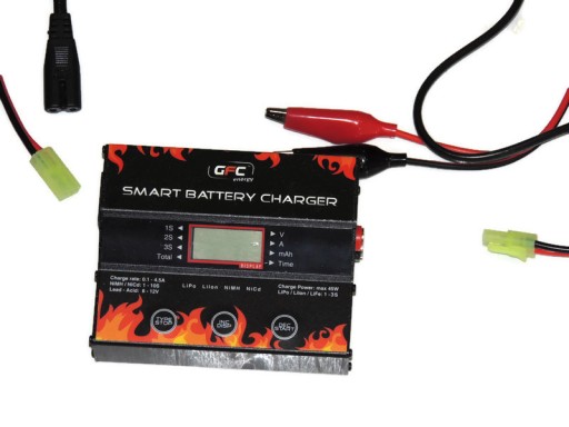 Мікропроцесорний зарядний пристрій Smart Battery Charger від GFC Energy. Зарядний пристрій підтримує найпопулярніші типи акумуляторів, такі як Li-Pol, Li-Ion, Li-Fe, Ni-Cd, Ni-Mh і Pb. Smart Battery Charger оснащено вбудованим блоком живлення, тому його можна підключити безпосередньо до розетки 230 В змінного струму за допомогою кабелю живлення, що входить у комплект, або до джерела живлення з напругою від 10 В до 15 В постійного струму.