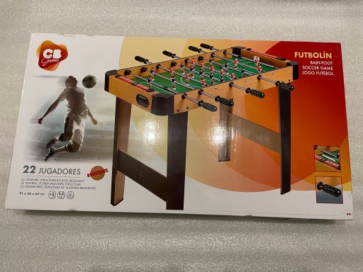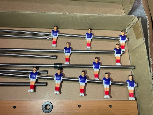 Примітка: продукт походить із т.зв повернення споживача (повернено протягом строку для відмови від договору). Однак на ньому немає значних слідів використання, ймовірно, його навіть не збирали. Набір повний - всі елементи є (за невеликим винятком - не вистачало однієї маленької металевої шайби для шурупів - ми її замінили на іншу аналогічних розмірів). Елементи можуть мати подряпини або потертості, утворені під час транспортування, коли один елемент терться об інший. Є втрата шпону на одній з ніжок, у верхній частині, біля гвинта. На поверхні поля невеликі подряпини, а з одного боку, в штрафній зоні, жирна пляма. Всі елементи цілі та не пошкоджені. Інструкції включені. Оригінальна упаковка, відкрита, пошкоджена, заклеєна.