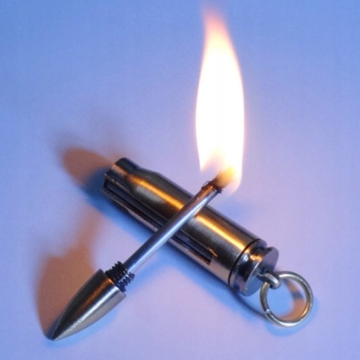 спина. Потім потрібно викрутити сірник, потерти його об кремінь збоку і ви отримаєте вогонь. Сірник горить у найгірших умовах