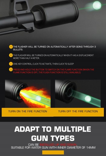 Високоякісний матеріал: корпус з алюмінієвого сплаву з вбудованим зарядним пристроєм USB,більш міцний і водонепроникний. Це ваш найкращий друг, щоб покращити ваш придушник і змусити ваші страйкбольні кулі світитися в темряві.