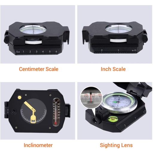 Компас має інклінометр із циферблатом у формі півкола: невеликий інструмент для визначення кута нахилу. Він незамінний під час геодезичних і військових справ. Для планування маршрутів на карті використовуються масштаби карти: доступний масштаб з поділками в сантиметрах і дюймах.