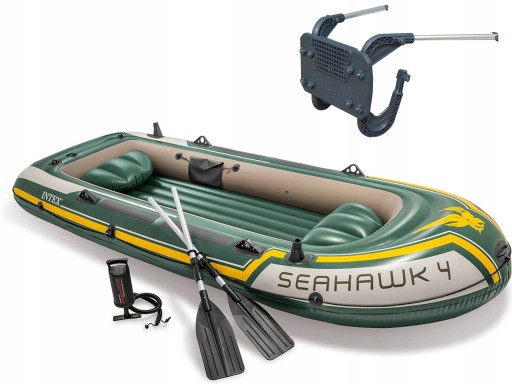 Надувний човен Seahawk 4 Set від відомої компанії INTEX з розмірами 351 x 145 x 48 см і максимальним навантаженням 480 кг дозволяє плавати до чотирьох осіб. Оскільки він має тримачі для кріплення вудки, на нього можна рибалити. Для тих, хто не любить сильно напружуватися під час веслування, хороша новина - до понтону можна підключити мотор. Виріб виготовлено з міцного ПВХ і складається з 3 незалежних повітряних камер, 2 весел, поршневого насоса і сумки для дрібниць. Крім того, понтон має бостонські клапани, що забезпечують швидке надування та скачування повітря.