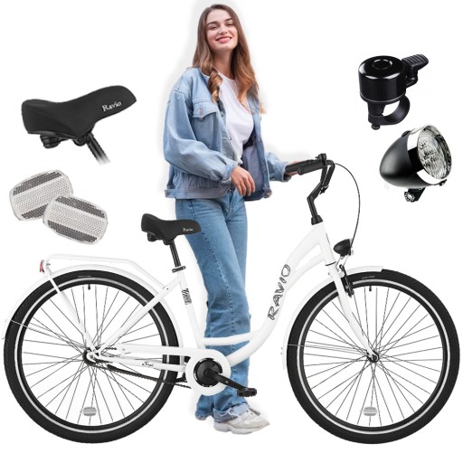 Жіночий міський велосипед Ravio Bikes Single - це стильна і надзвичайно практична пропозиція для людей, які цінують комфорт і зручність у повсякденному житті. Оснащений елементами, які покращують комфорт використання, такими як переднє та заднє освітлення, кришка ланцюга, підставка або стійка, це автомобіль мрії для щоденного використання, особливо для покупок або роботи.
