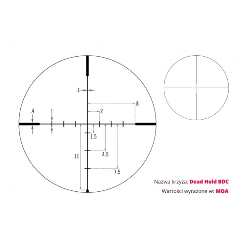 Прицільна сітка Dead-Hold BDC полегшує коригування пострілу та усуває необхідність робити наступні виправлення. Призначений для будь-якої стрільби або полювання, на різних дистанціях, тобто там, де необхідно довго прицілюватися.