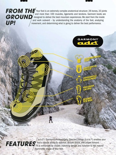 - Ваша стопа – це надзвичайно складна анатомічна структура: 26 кісток, 33 суглоби та понад 100 м’язів, зв’язок і сухожиль. Черевики Garmont® розроблені, щоб забезпечити найкращі враження від гірських походів. Ми починаємо зсередини і працюємо назовні - розуміння анатомії стопи, аналізу рухів і визначення того, що забезпечить найкращу продуктивність.