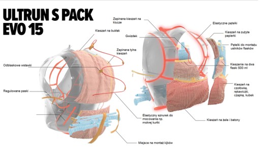 Ultrun Pack Evo 15 - це нова, вдосконалена версія рюкзака Compressport Ultrun. Легкий і мінімалістичний біговий рюкзак дозволить взяти з собою всі необхідні речі для ультрамаршруту, тренування або звичайної пробіжки. Ергономічний крій добре прилягає до тіла, забезпечує комфорт і запобігає роздратування. Виготовлений з гнучкого матеріалу, він забезпечує комфорт і свободу рухів, а також забезпечує ефективне завантаження вмісту. Практично в кишенях поміститься все необхідне спорядження та аксесуари, включаючи куртку, термоковдру, дві м'які пляшки, ємність для води та необхідне для маршруту провіант. У набір входять дві практичні м'які пляшки ємністю 500 мл.