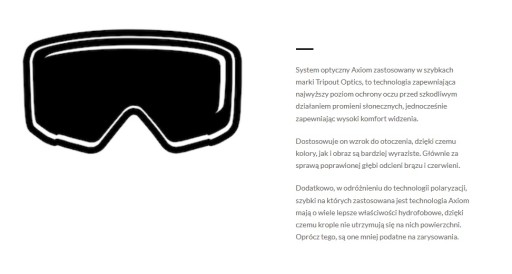 - Покриття Axiom - забезпечує найвищий рівень захисту очей від шкідливого впливу сонячних променів, забезпечуючи при цьому високий зоровий комфорт. Завдяки цьому кольори і зображення стають більш виразними. Порівняно з поляризаційним - покриття Axiom менш сприйнятливе до подряпин і має набагато кращі гідрофобні властивості, завдяки чому краплі води не залишаються на поверхні скла.