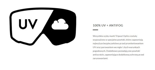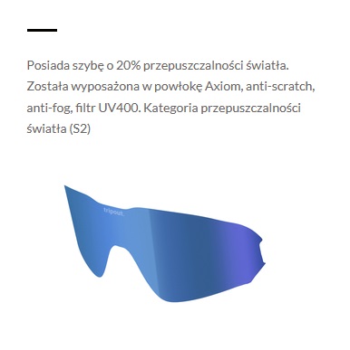 - 20% світлопропускання (категорія S2) - лінзи захистять наш зір від інтенсивного сонячного світла та збережуть хорошу видимість під час гірших умов їзди на велосипеді, таких як дощ або хмарність.