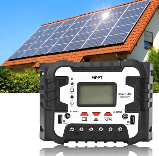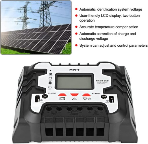 РК-дисплей Система автоматичної ідентифікації сонячного контролера, напруга 1224 В. Зручний РК-дисплей з двома кнопками керування. Ефективний захист Контролер сонячного заряду Надійний захист від перенапруги Захист від короткого замикання Захист від перевантаження Захист від перезаряду Захист від перерозряду. Тривалий термін служби. Точна температурна компенсація, автоматична корекція напруги заряджання та розряджання та збільшений термін служби акумулятора. Використання сонячних панелей Батарея та сонячний контролер заряду з’єднані разом, а негативний MOSFET з’єднаний послідовно. Відповідна сцена Система може регулювати та контролювати параметри. Підходить для домашніх, промислових, комерційних, автомобільних і мотоциклетних акумуляторів.