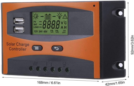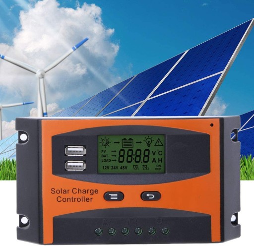 Вбудований промисловий мікропроцесорний контролер для підвищення продуктивності. Параметри заряджання та розряджання на великому РК-дисплеї можна регулювати за допомогою функції пам’яті відключення. Подвійний вихід USB максимальний струм 2A підтримує зарядку мобільного телефону. Повне триступеневе ШІМ-керування зарядкою з відображенням температури навколишнього середовища. Із захистом від короткого замикання, зворотного підключення та захисту від перевантаження.