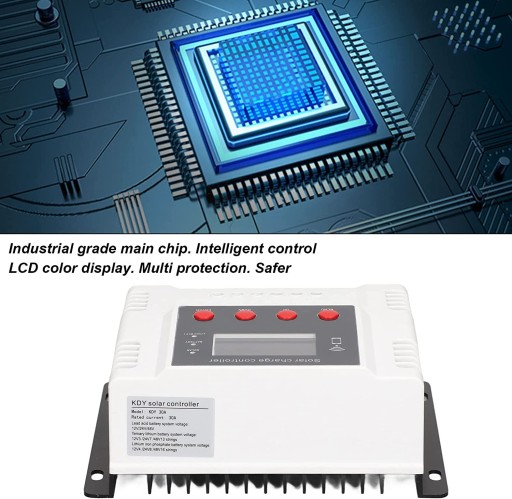 Функція Цей сонячний контролер для фотоелектричної генерації електроенергії збирає енергію від сонячної панелі та зберігає її в акумуляторі. ШІМ-заряджання Фотоелектричний контролер використовує ШІМ-заряджання з повним 3-ступеневим ШІМ-керуванням заряджанням. Багаторазовий захист. Сонячний контролер має вбудований захист від заряду, короткого замикання, розриву ланцюга та захист від зворотного з’єднання, усі вони працюють самостійно та не пошкоджують контролер. РК-дисплей Сонячний контролер оснащений великим РК-екраном, на якому можна регулювати параметри заряджання та розряджання. Мікросхема промислового класу Сонячний контролер використовує основний чіп промислового класу зі стабільною та довговічною продуктивністю.