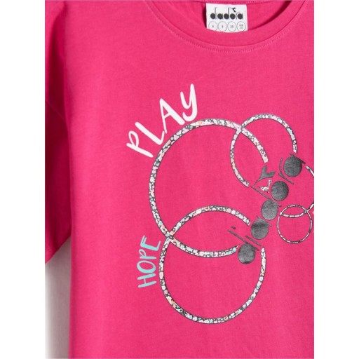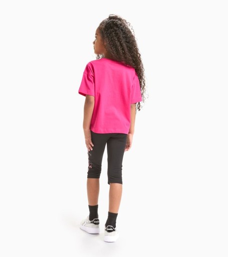 Дитячий костюм Diadora JG. Комплект Fregio Junior - футболка звичайного крою з короткими рукавами і круглим вирізом і легінси довжиною до коліна. Дівчачий комплект з легкої та повітряної бавовни чудово підійде для занять спортом та тренувань.