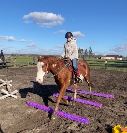 Яскраві кольори та візерунки на жердинах (які ми друкуємо самі) чудово задіюють обидві півкулі мозку коня, необхідні для розвитку правильних моделей рухів.