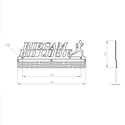 Металева вішалка для медалей RUNNER виготовлена зі сталі з порошковим покриттям товщиною 2 мм. Технологія лазерного різання дозволила отримати деталі високої якості. Пропозиція магазину Piękne Cutting включає вішалку BIEGACZ з полицею для кубків і статуеток, а також інші види вішалок для медалей.