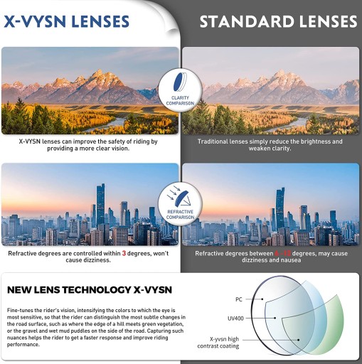 【Технологія лінз SCVCN】Фотохромні велосипедні окуляри спочатку прозорі, а потім стають червоними під яскравим сонячним світлом. Лінза з матеріалу SCVCN PC забезпечує високу чіткість, стійкість до ударів і подряпин, а також легка протягом усього дня. Захисне покриття UV400 блокує 100% шкідливих променів UVA та UVB, що допомагає захистити ваші очі від сильного сонячного світла, бруду, пилу та високої рослинності.