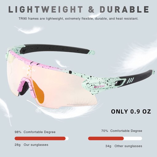 【Лише близько 28 г, зручні у використанні та носінні】 Фотохромні спортивні сонцезахисні окуляри SCVCN ідеально підходять для їзди на велосипеді, горних велосипедів, мотоциклів, бігу, лиж, бейсболу, волейболу, тенісу, водіння, триатлону, перегонів, альпінізму, софтболу, альпінізму, трекінгу, гольфу , піші прогулянки, катання на човнах, полювання або будь-який інший улюблений вид активного відпочинку. Модний і стильний дизайн, з багатим колірним поєднанням оправи і лінз підходять і для повсякденного носіння.