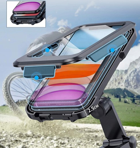 Водонепроникний тримач для телефону має закриту конструкцію, що робить його безпечнішим за більшість наявних на ринку тримачів. Забезпечує рівень водонепроникності IPX6, щоб повністю захистити ваш телефон від бризок, дощу, снігу, бруду та пилу. Він має унікальну систему регулювання гвинтового кріплення та стійкий до ударів. Чохол захищає телефон від падінь.