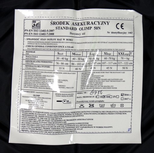 Жилети мають сертифікат ЄС CE, виданий Польським реєстром судноплавства - органом, який сертифікує рятувальні вироби, і відповідають європейським стандартам PN-EN ISO 12402-5.