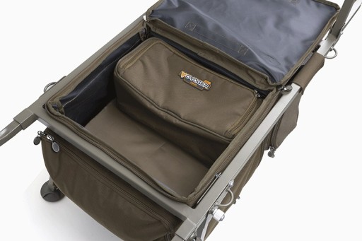 - Висувна передня частина тачки - дозволяє розмістити спереду сумку Voyager, Camolite Compact Barrow Bag або Low Level Bag (усі доступні окремо) і використовувати тачку в «сидячому режимі», а також транспортувати ліжко. Якщо вам не потрібне ліжко під час риболовлі, просто посуньте передню частину тачки назад і переверніть самі сумки Barrow/Low Level Bags. Завдяки цьому рішенню тачка залишається збалансованою як на коротких, так і на довгих сесіях.