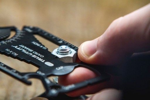 Він виготовлений з чорної нержавіючої сталі, покритої титаном. Він має приголомшливий зовнішній вигляд і міцну конструкцію. Виріб поміщається у вашому гаманці, тому ви можете мати його під рукою в будь-який час. Він має такі функції: хрестова викрутка, 3 плоскі викрутки, 20 ріжкових ключів (дюймових і метричних), ключ для велосипедних спиць, міні-лом, відкривачка для консервів, відкривачка для пляшок, мірна стрічка (дюймів і метричних), транспортир.