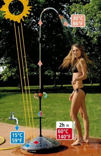 Подібно до сонячної батареї, базовий резервуар, підключений до мережі водопостачання та виставлений на сонце протягом приблизно 2 годин, нагріває воду, що міститься в ньому, до температури понад 60 градусів за Цельсієм. Ця вода, якщо її правильно змішати з холодною водою за допомогою міксера, дасть гарячу воду з температурою близько 30 градусів за Цельсієм. Ви можете отримати 7/8 розпилень протягом приблизно двох хвилин кожне, але якщо між одним розпиленням і наступним є проміжки в кілька хвилин, можлива кількість розпилень практично нескінченна. Клапан регулювання тиску, розташований в основі, дозволяє використовувати душ у повній безпеці та комфорті.