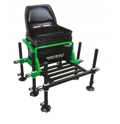 Професійне поворотне сидіння зі складною спинкою, побудоване на зварному алюмінієвому каркасі. Регульована висота ніжок, шарнірні стопи, можливість установки додаткових касет і ходової системи. Сидіння відповідного профілю оснащене ручкою, яка допомагає ловити рибу ногою. Має: 6 телескопічних незалежно регульованих ніжок діаметром 36 мм з регулюванням кута, що вкрай важливо для гарної та стійкої установки платформи, дуже зручне сидіння, транспортувальний ремінь та тримач для палиці в сидінні. Дві касети для комплектів: одна під сидіння, інша висувається з-під сидіння - захищена від випадання. Він характеризується дуже гарною якістю виготовлення та матеріалів, він дуже легкий, а його найбільшою перевагою є дуже доступна ціна.