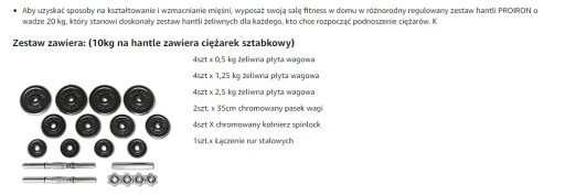 - Набір гантелей 20 кг: 4*2,5 кг, 4*1,25,4*0,5 кг, 2 * штанга для гантелей, 1 * з’єднувальна сталева трубка, 4 * хромований комір
